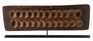 Tabuleiro: mancala 2×12, duas fileiras, cada uma com doze buracos.