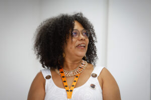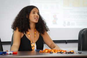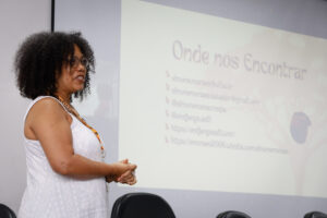 Em seguida, a professora Simone apresentou a concepção e os objetivos das oficinas Ananse e os integrantes relataram como foi a experiência de elaborar as atividades e aplicá-las nas escolas.